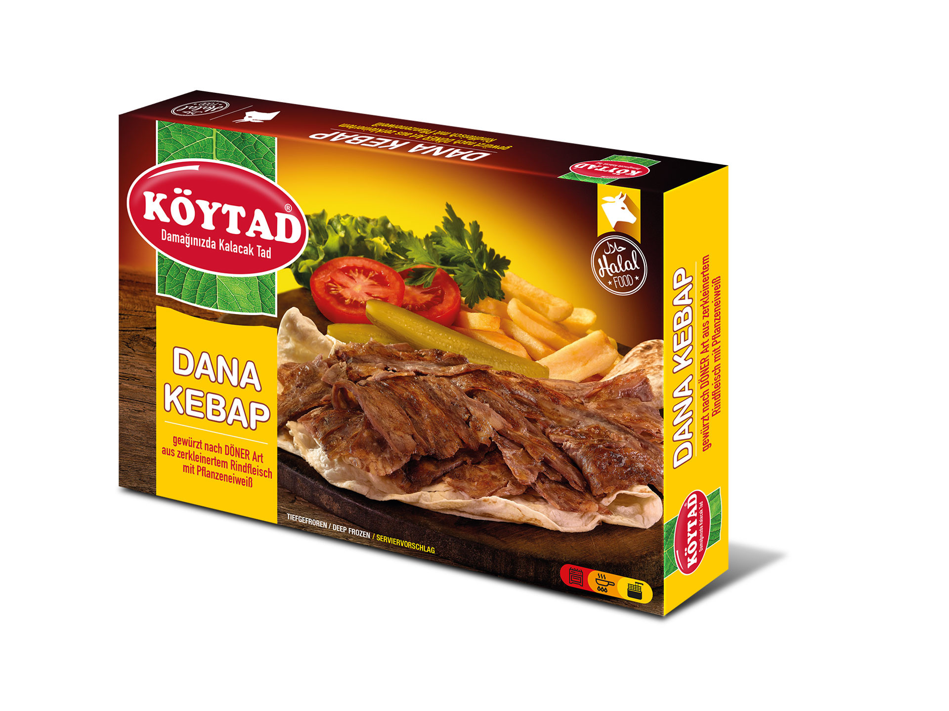 Kebab de boeuf surgelé. Préparé à partir de boeuf finement haché avec des protéines végétales. Assaisoné et cuit de manière traditionnelle. Veau (70%); eau, chapelure, sel de table, protéines de soja, épices, fécule de pomme de terre, stabilisant : diphostat, triphosphate, correcteur d'acidité : lactate de calcium, dextrose.